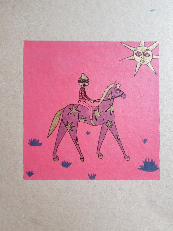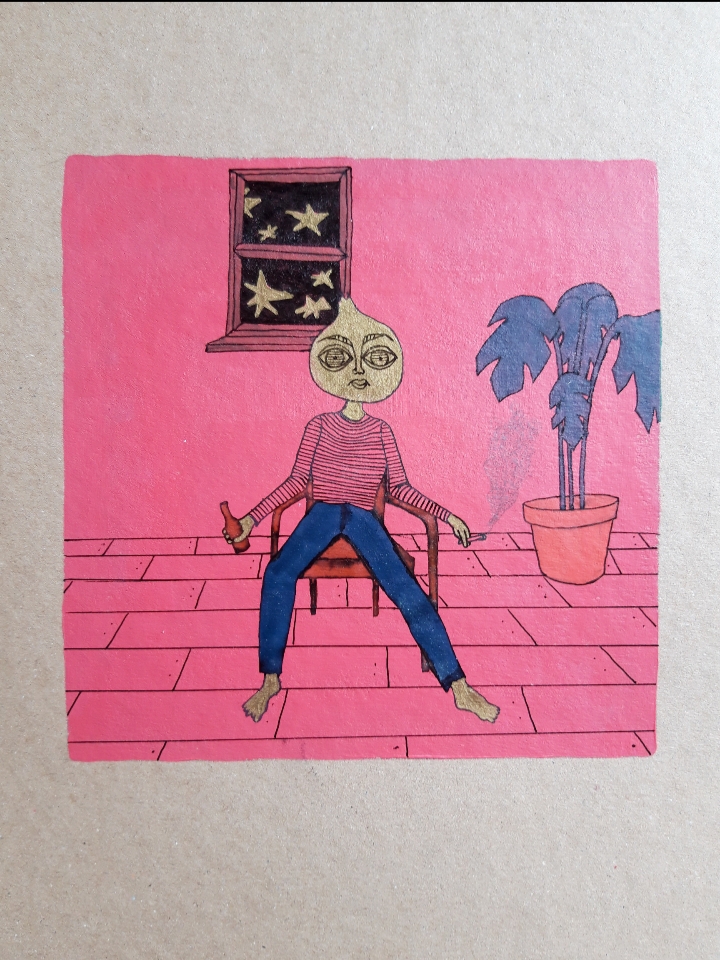 I take inspiration from artists who use a lot of bold colours and simple lines. The juxtaposition of patterns and colours on this piece by Edelhuber has been influential within my use of gold and bright colours that I am starting to introduce into the Onion Illustrations.
